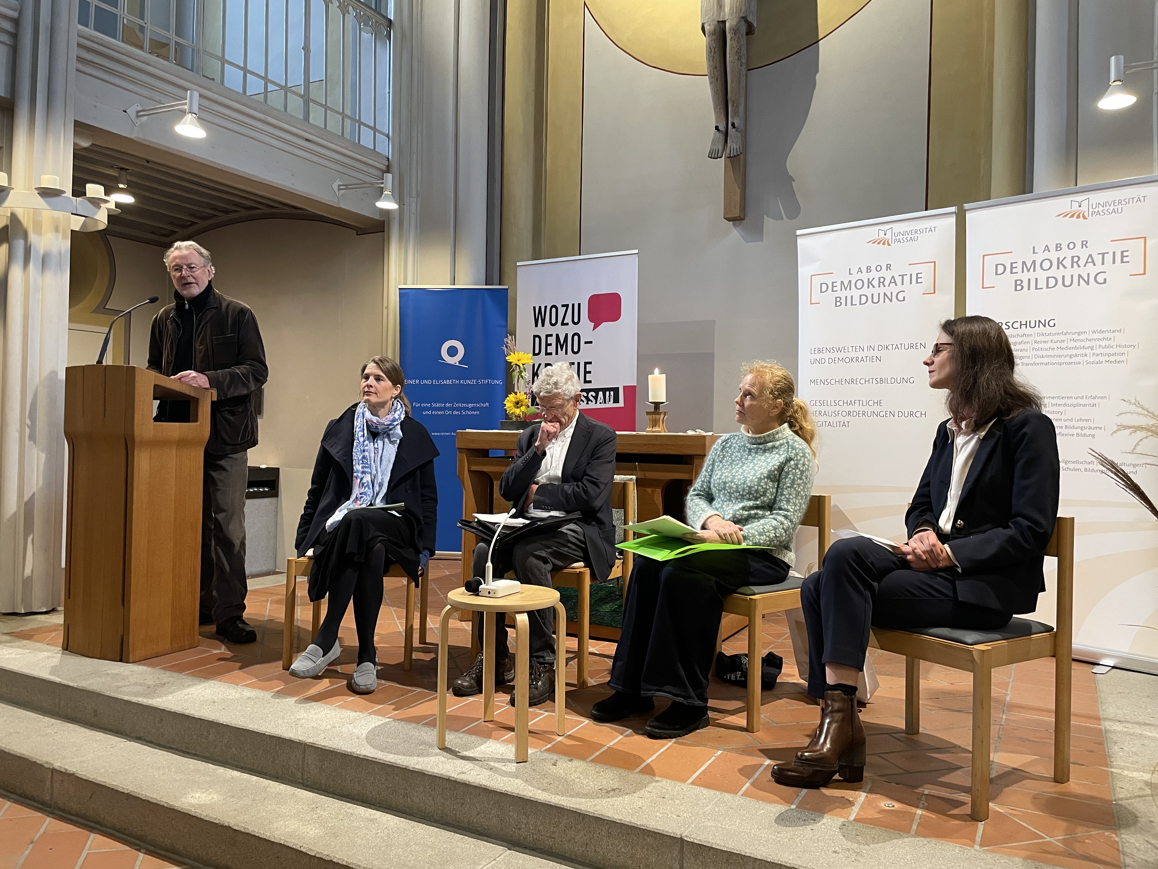Dr. Linda von Keyserlingk-Rehbein (Geschäftsführerin des Labors für Demokratiebildung der Universität Passau sowie stellvertretende Vorstandsvorsitzende der Kunze Stiftung) reflektierte im Gespräch mit Bernd Dämmrich und seiner Tochter Dr. Ute Willersinn den Wert von Menschenrechten in Demokratien. Die Familie Dämmrich erlebte in der SED-Diktatur nach einem gescheiterten Fluchtversuch Haft und Repressionen und konnte 1979 schließlich nach Passau ausreisen.