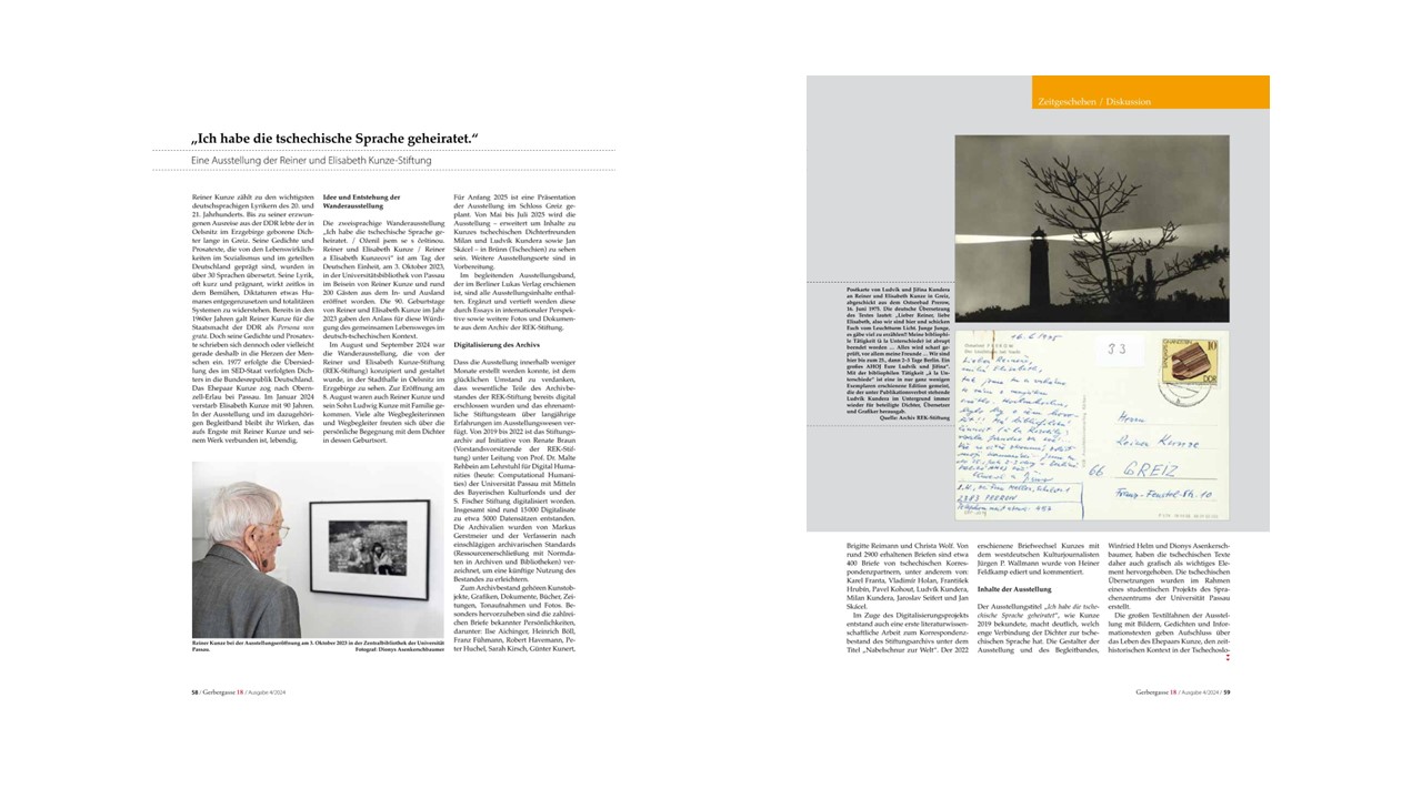 Linda von Keyserlingk-Rehbein, "Ich habe die tschechische Sprache geheiratet". Eine Ausstellung der Reiner und Elisabeth Kunze-Stiftung, in: Gerbergasse 18, 4/2024, S. 58-61.