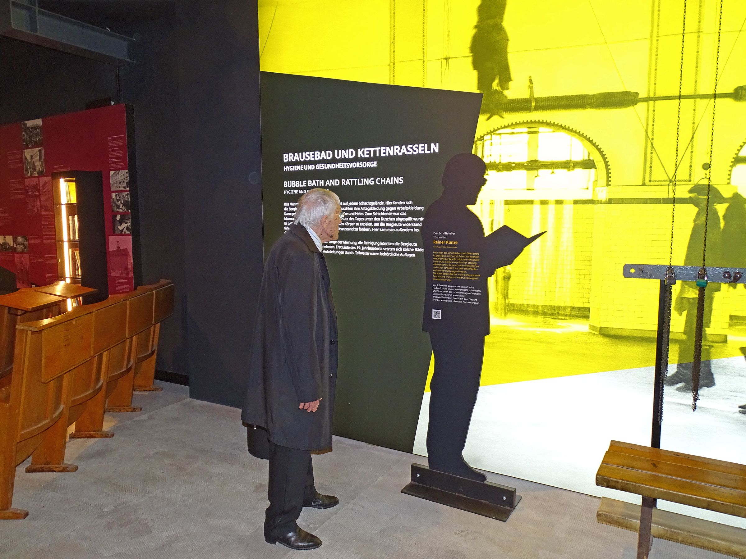 Im Ausstellungsraum "Brausebad und Kettenrasseln" steht eine Silhouettenfigurine von Reiner Kunze, dem weltweit rezipierten Dichter und Ehrenbürger von Oelsnitz. Beim Betreten dieser "Waschkaue" erklingt folgendes Gedicht von Reiner Kunze, das er 2006 über seine Kindheitserinnerungen unter Tage geschrieben hat: