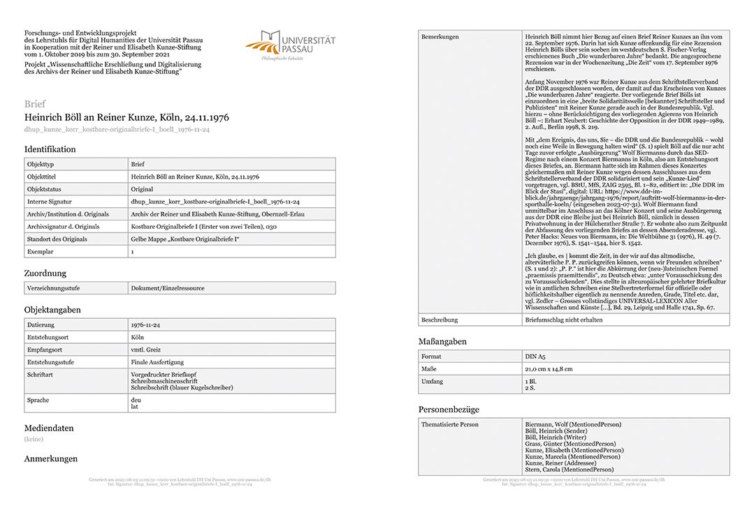 Exportované PDF dopisu Heinricha Bölla Reineru Kunzemu ze 24.11. 1976, evidovaného v databázi vytvořené v rámci projektu digitalizace a zpřístupnění archivu Reinera Kunzeho (2019–2022) na Katedře digitálních humanitních věd (Lehrstuhl für Digital Humanities) Univerzity v Pasově (dnes nese název Katedra výpočetních humanitních věd/Lehrstuhl für Computational Humanities).