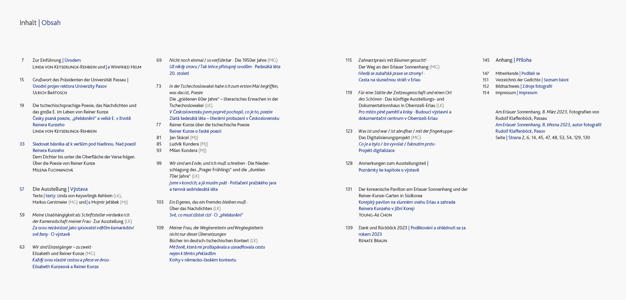 Der zweisprachige Band zur Wanderausstellung »Ich habe die tschechische Sprache geheiratet« würdigt den Lyriker und Übersetzer Reiner Kunze im deutsch-tschechischen Kontext und beleuchtet zugleich die zentrale Rolle, die seine Frau für sein Leben und Werk innehatte. Fotos und Dokumente aus dem Archiv der Reiner und Elisabeth Kunze Stiftung illustrieren den gemeinsamen Lebensweg. Eine Porträtserie des Passauer Fotografen Rudolf Klaffenböck zeigt das Paar im Jahr 2023, in dem Reiner und Elisabeth Kunze 90 Jahre alt geworden sind. Essays vertiefen die Ausstellungsinhalte in internationaler Perspektive.